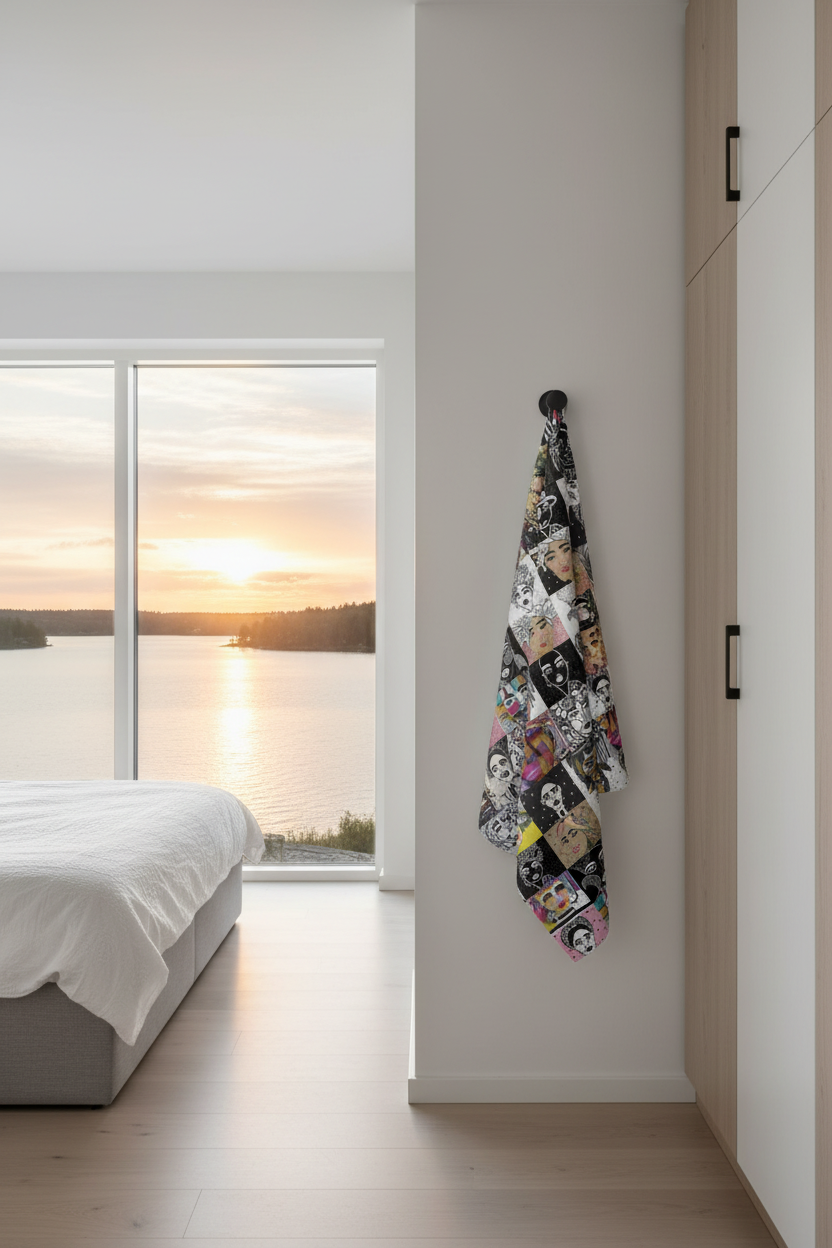 Tillverkad i Litauen. Målningen på handduken är handritad av den litauiska konstnären Garbanota.