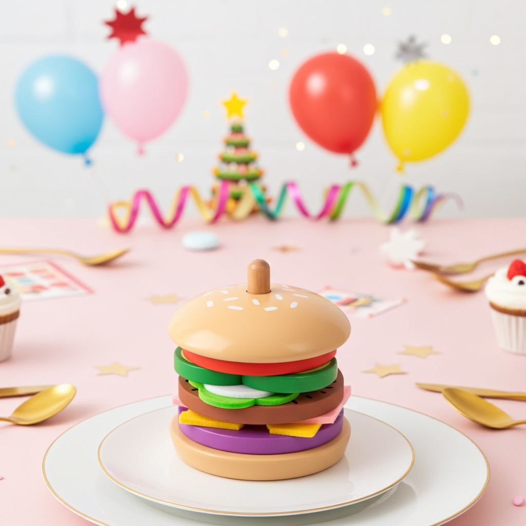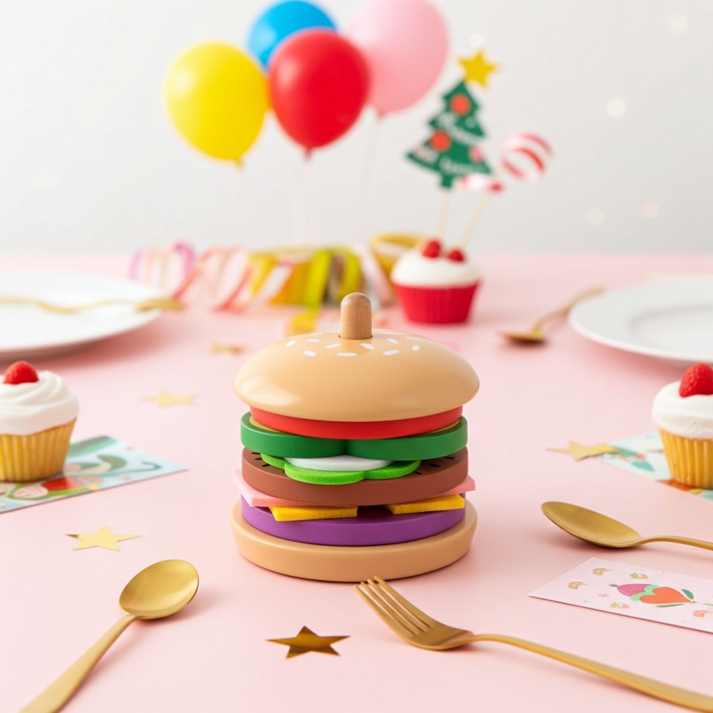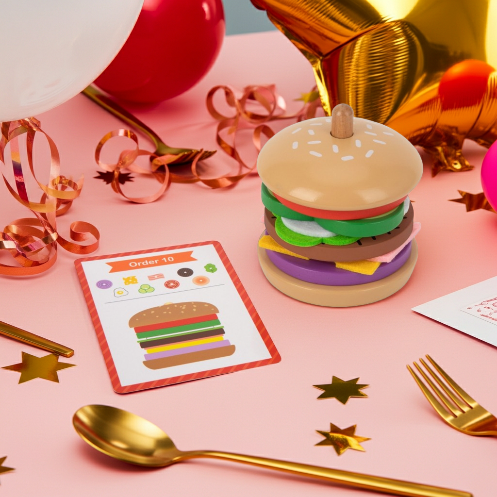 Bygg en hamburgare, ingen grill behövs. Detta hamburgerset i trä låter barn stapla sina egna skapelser eller följa utmaningskort för att matcha specifika recept. Det är ett roligt sätt att utveckla finmotorik, minne och fantasi – utan kladd.