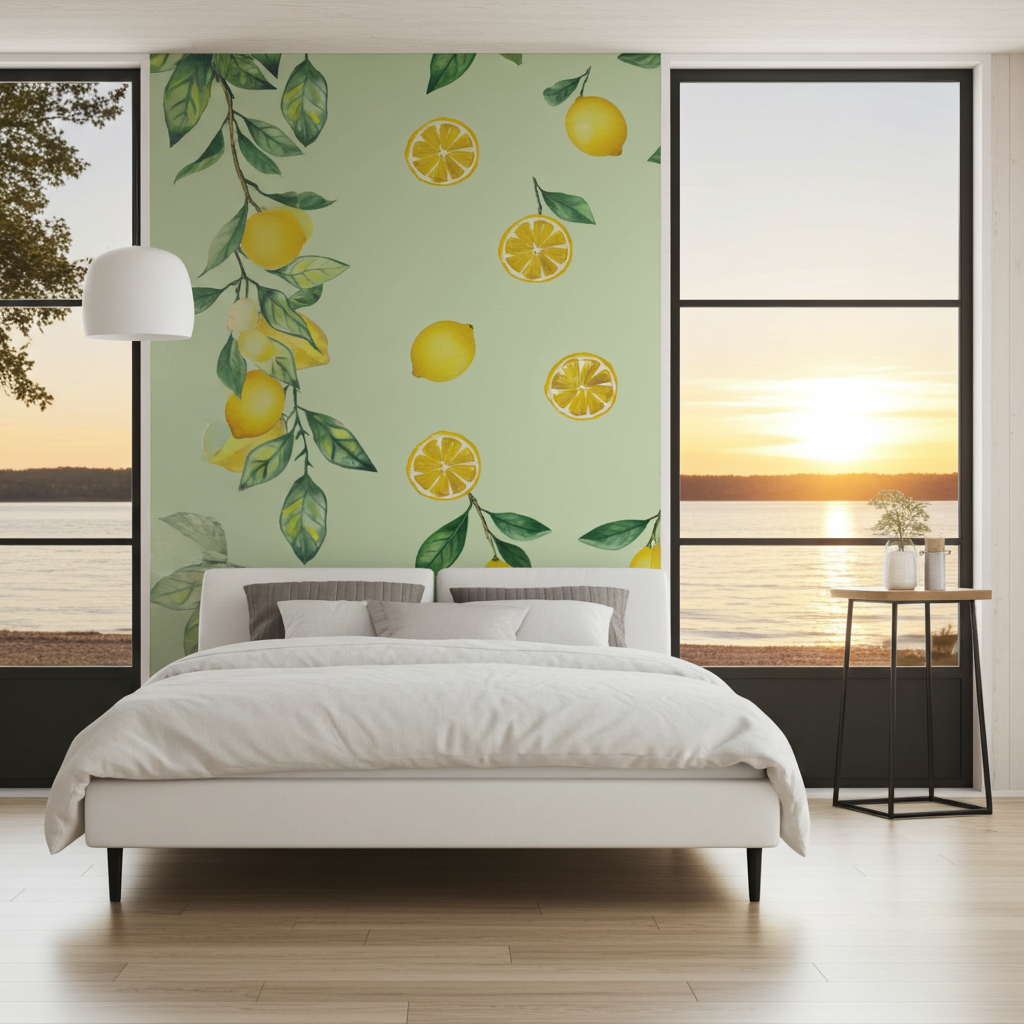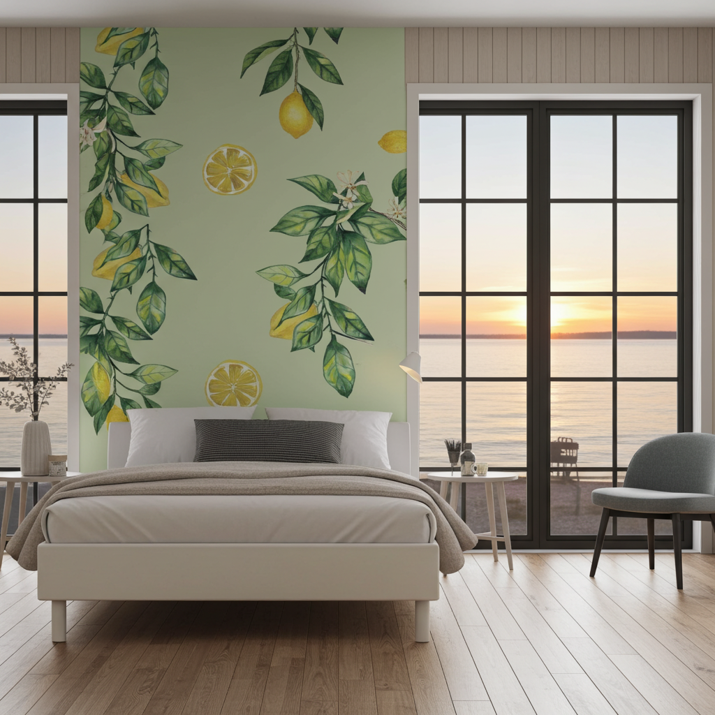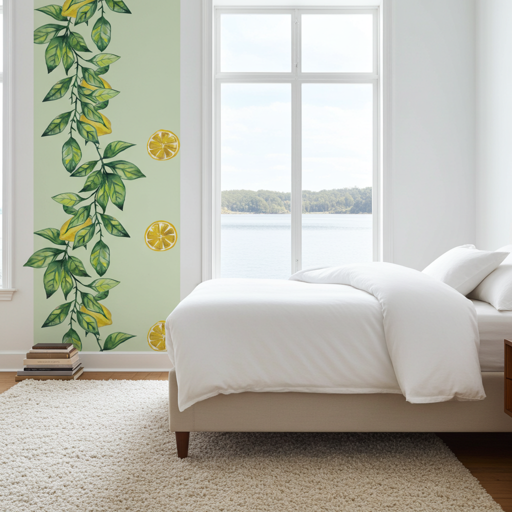 Lemon Branch är en vacker version av tapeter i Provence-stil. Ett utmärkt val för rum med lägre takhöjd, då tryckets vertikala karaktär visuellt höjer rummet. Passar perfekt för kök, vardagsrum och sommarhusinredningar. Passar vackert ihop med tapeterna Yellow Stripes och Green Mint Buffalo Check.