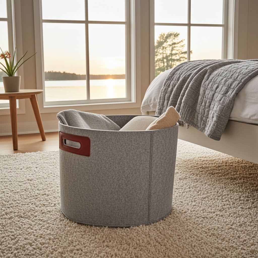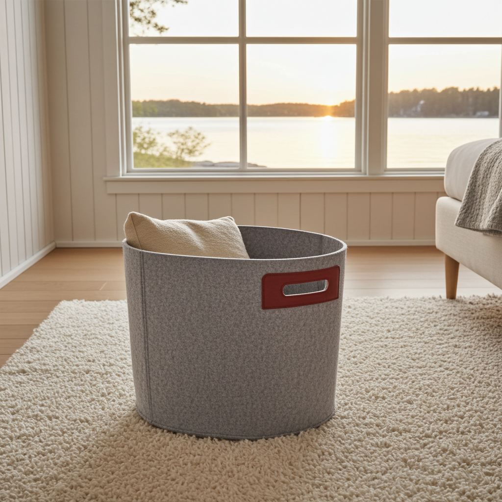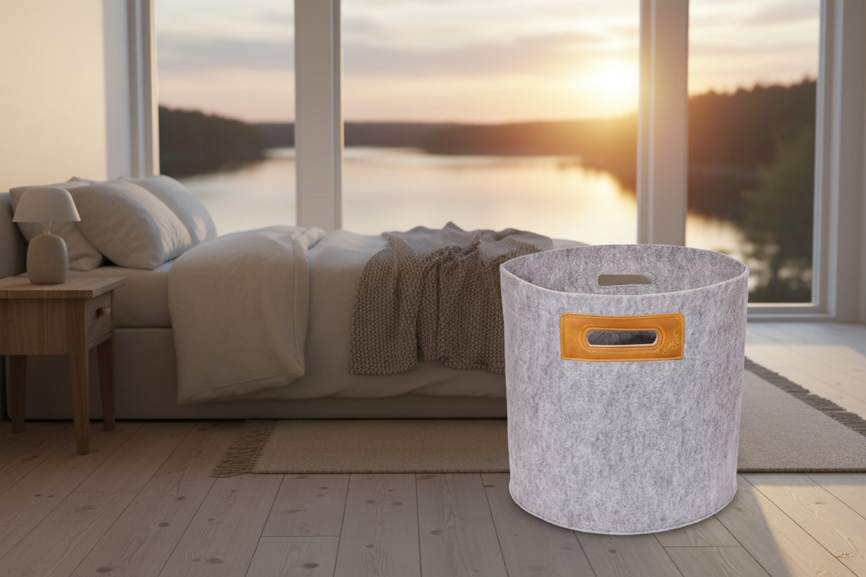 En inredningskorg gjord av stabil, formhållande filt. Läderdetaljerna på korgens handtag är gjorda av produktionsrester och finns i olika färger.