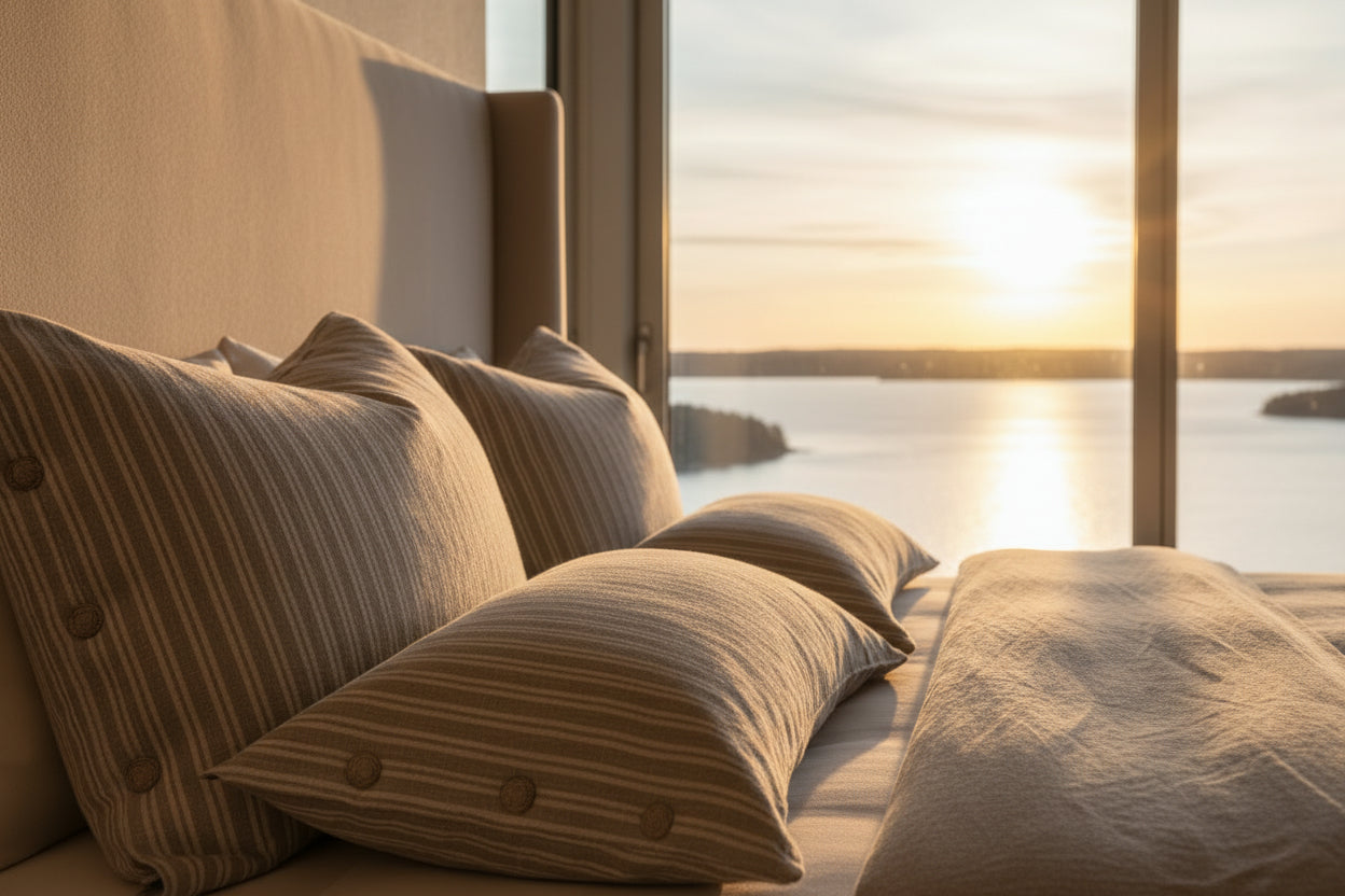Uppgradera kuddkänslan med två lyxigt mjuka örngott i kammad bomull. Tyget (400 TC) har en chambray-liknande melangeeffekt som ger ett avslappnat, men ändå stilrent uttryck. Sidans dekorativa träknappar fungerar både som fin detalj och praktisk kuvertstängning – inga glidande kuddar, bara ren sovkomfort.