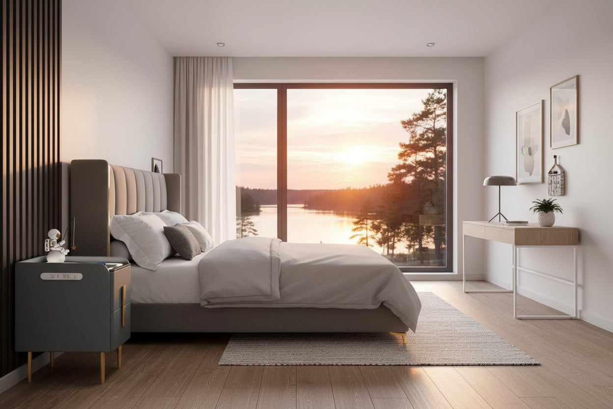 - Ingår: 1 x Sängbord med 2 lådor, 1 x Laddare, integrerad, trådlös för nyare mobiltelefoner, 1 x Belysning, integrerad med touchknapp och 3 olika ljusbilder