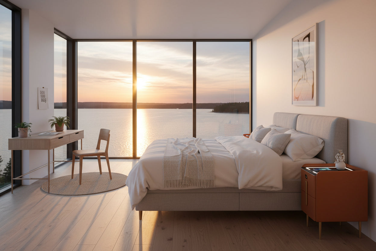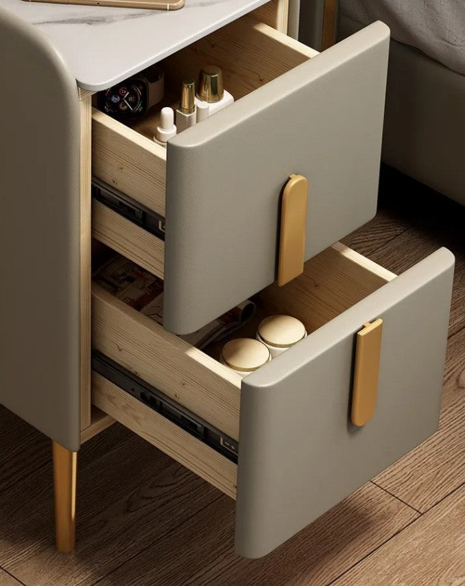 Förvara dina saker och ladda mobilen med vårt NARROW Sängbord. Den stilrena ytan har en mjuk, nappaläderfinish som utstrålar exklusivitet och kräver minimalt underhåll. Välj färg mellan dovt brunröd eller en sobrare gråblå med gulddetaljer.