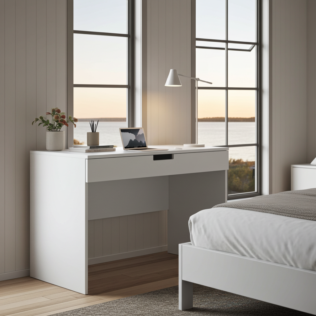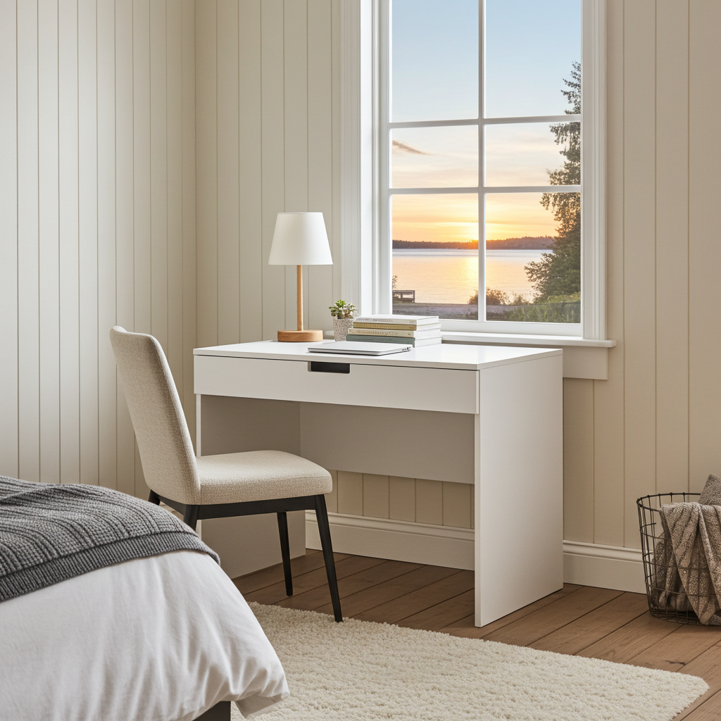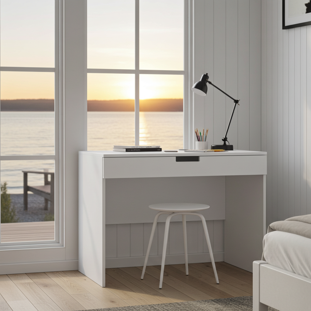 Byggt för barn och tonåringar som behöver en praktisk plats för läxor, teckning eller spel. Skrivbordet håller det enkelt, en stor arbetsyta, en solid konstruktion och en låda som faktiskt rymmer deras saker.