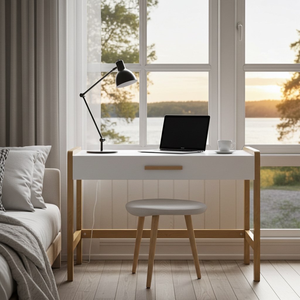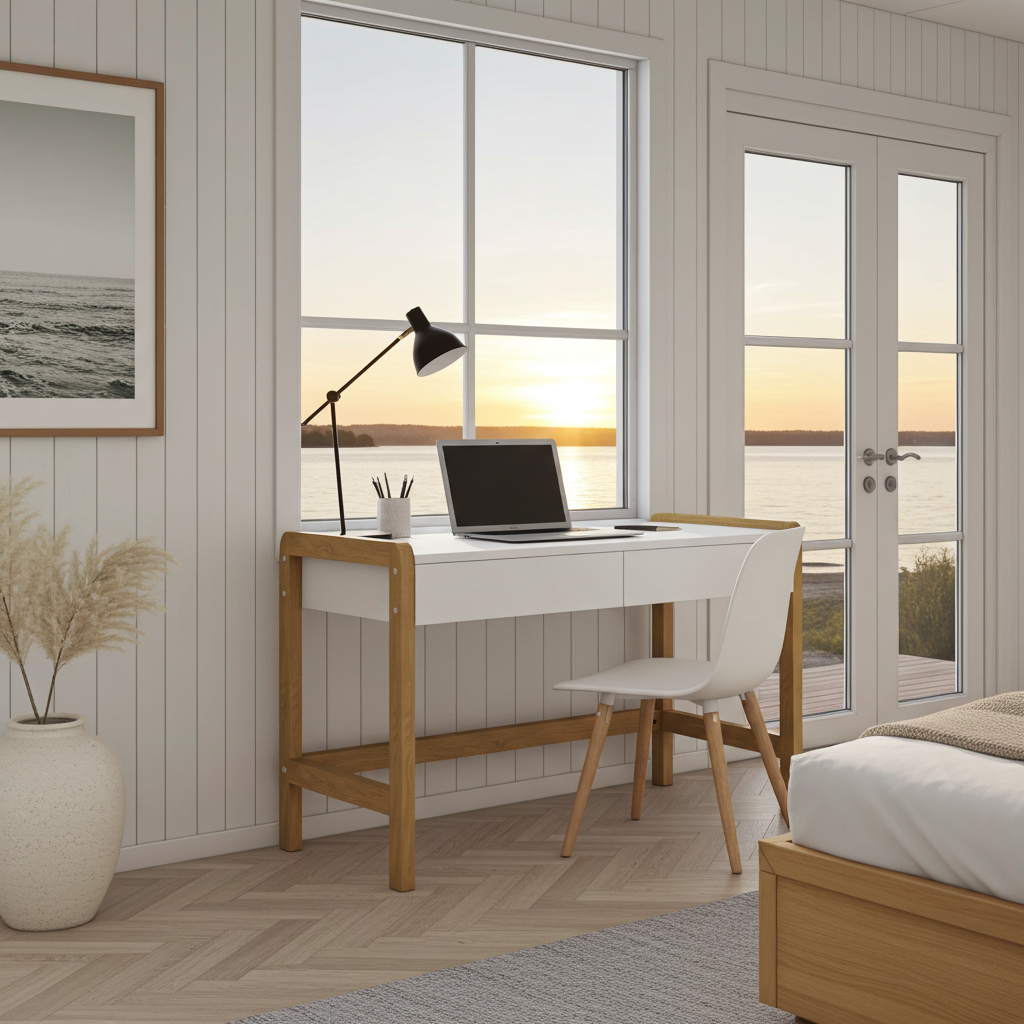 Skrivbordet Viktor är en möbel i skandinavisk stil, designad för sovrum. Tillverkad i Polen, kombinerar den funktionalitet med en ren estetik.